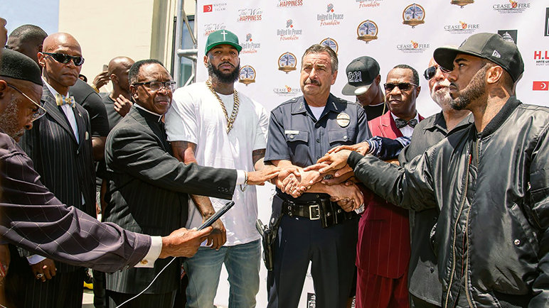 В июле 2016 года случившиеся один за другим расстрелы двух молодых темнокожих парней полицейскими довели напряжение во всей стране до максимальной точки. Рэппер Гейм хотел сделать что-то полезное для Лос-Анджелеса и обратился к священнику Тони Мухаммеду за советом. Тони предложил Гейму собрать членов банд Лос-Анджелеса, чтобы пойти в полицию с миром. Вместе с суперзвездой рэппером Снуп Догом они организовали марш к штаб-квартире полицейского управления Лос-Анджелеса, где встретились с начальником полиции.